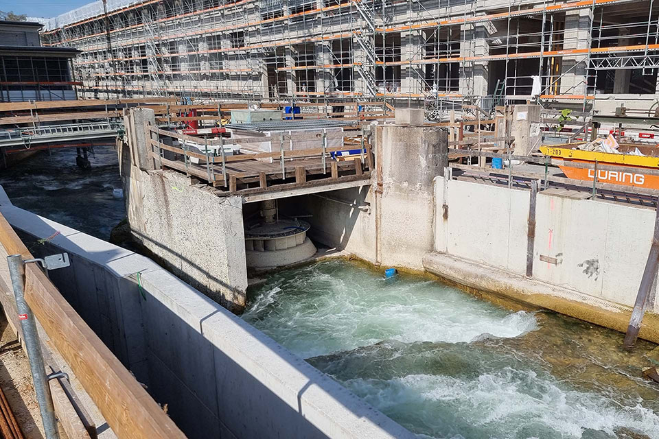 Beim Neubau des Wasserkraftwerks auf dem Papieri Areal in Cham, sorgt eine elastische Turbinenlagerung für schwingungsfreie Energiegewinnung und erfüllt die SIA 181 für störungsfreies Wohnen und Arbeiten.