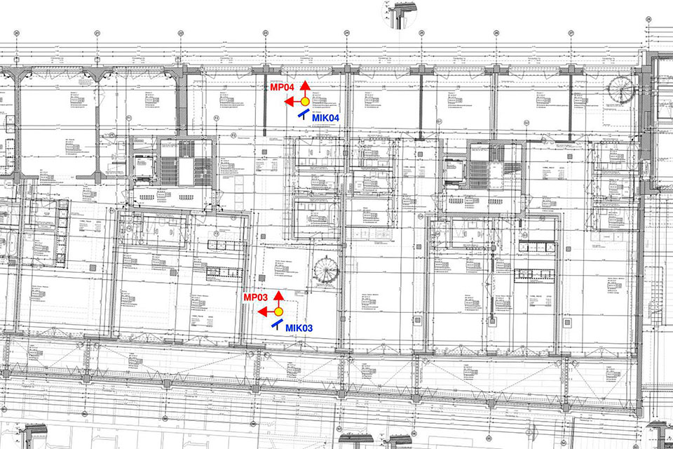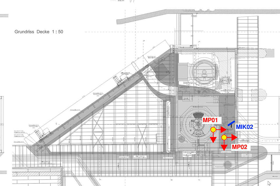 Es wurde sowohl auf dem Turbinenblock (MP 01), neben dem gelagerten Turbinenblock (MP 02), sowie in zwei Wohnungen (MP 03 und MP 04) die Schwingungen gemessen.