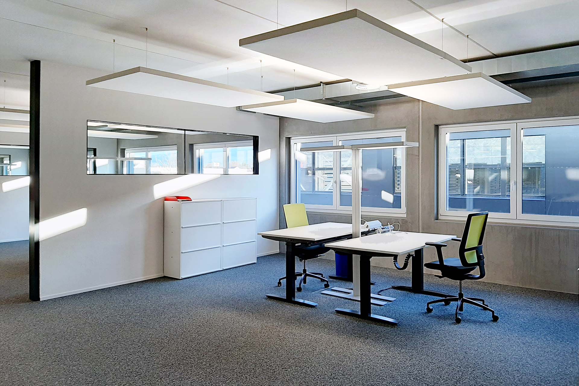 Idéalement, le niveau de pression acoustique devrait être réduit de 10 à 15 dB(A) par des mesures prises dans les bureaux, ce qui correspondrait à un niveau de bruit aérien de 35 à 40 dB(A). Ainsi, les ponts roulants seraient toujours audibles, mais cela ne devrait plus être gênant dans les bureaux au quotidien (par exemple, l‘entreprise Roche à Bâle exige un niveau sonore de base d‘au moins 40 dB(A) pour les bureaux paysagers nouvellement planifiés)*.