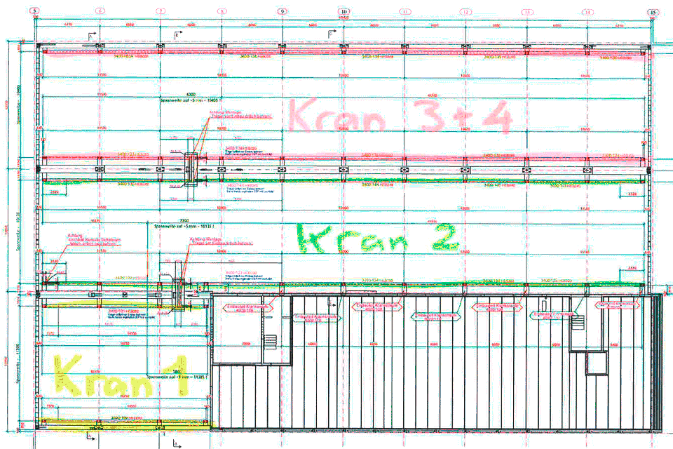 Les mesures ont été effectuées presque uniquement avec la grue n° 2. Avec celle-ci, d‘une part, le transport des charges est très simple (avant tout zone de circulation) et d‘autre part, elle est directement adjacente aux bureaux.
