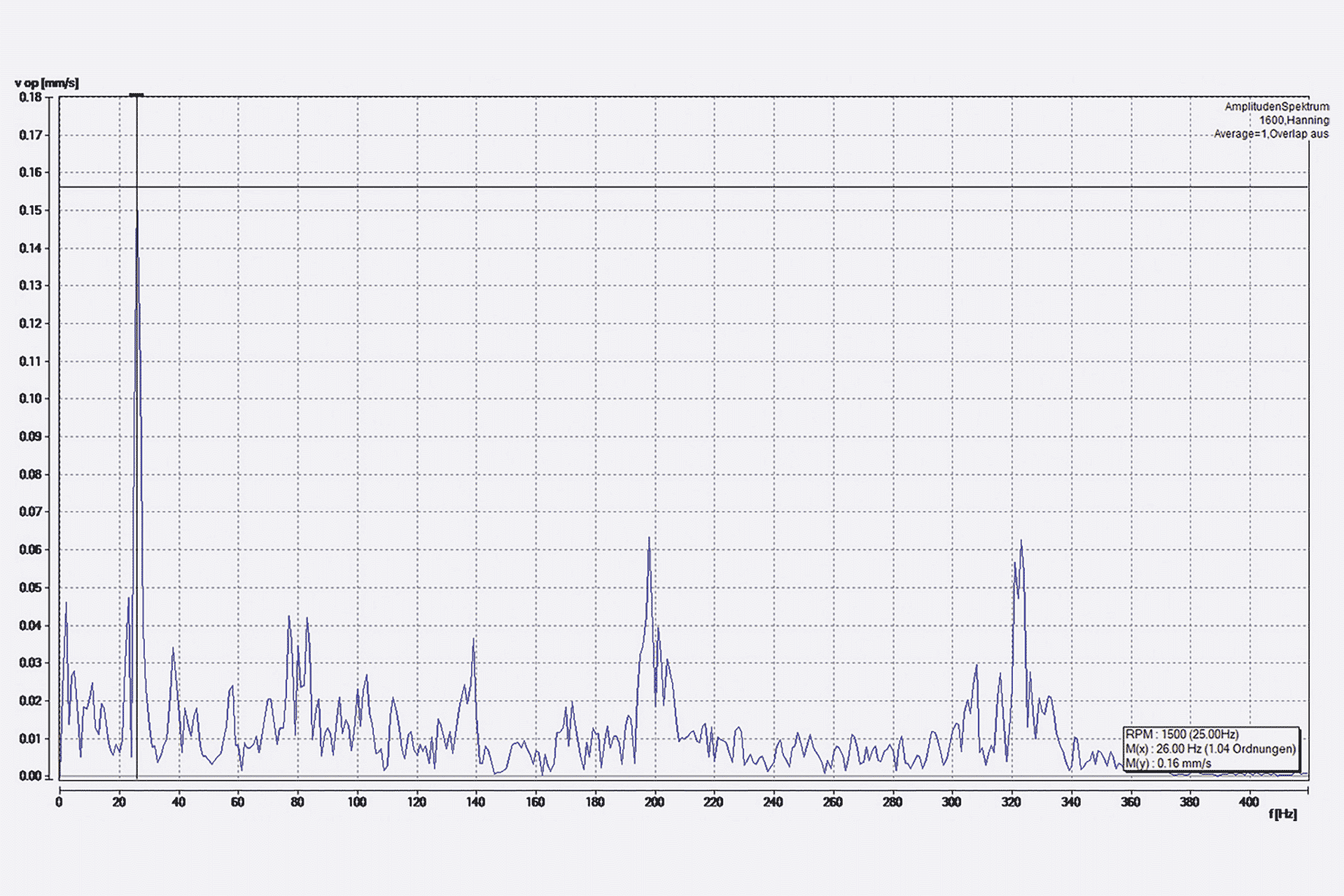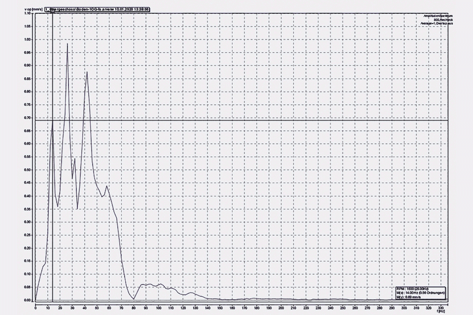 du plafond au-dessus du rez-de-chaussée lors du déplacement du pont roulant à la vitesse maximale, sans charge (déplacement à vide) ; le pic à 26 Hz est dominant. Il ressort de la mesure de la fréquence propre du plafond que la fréquence de 26 Hz est également bien resentie.