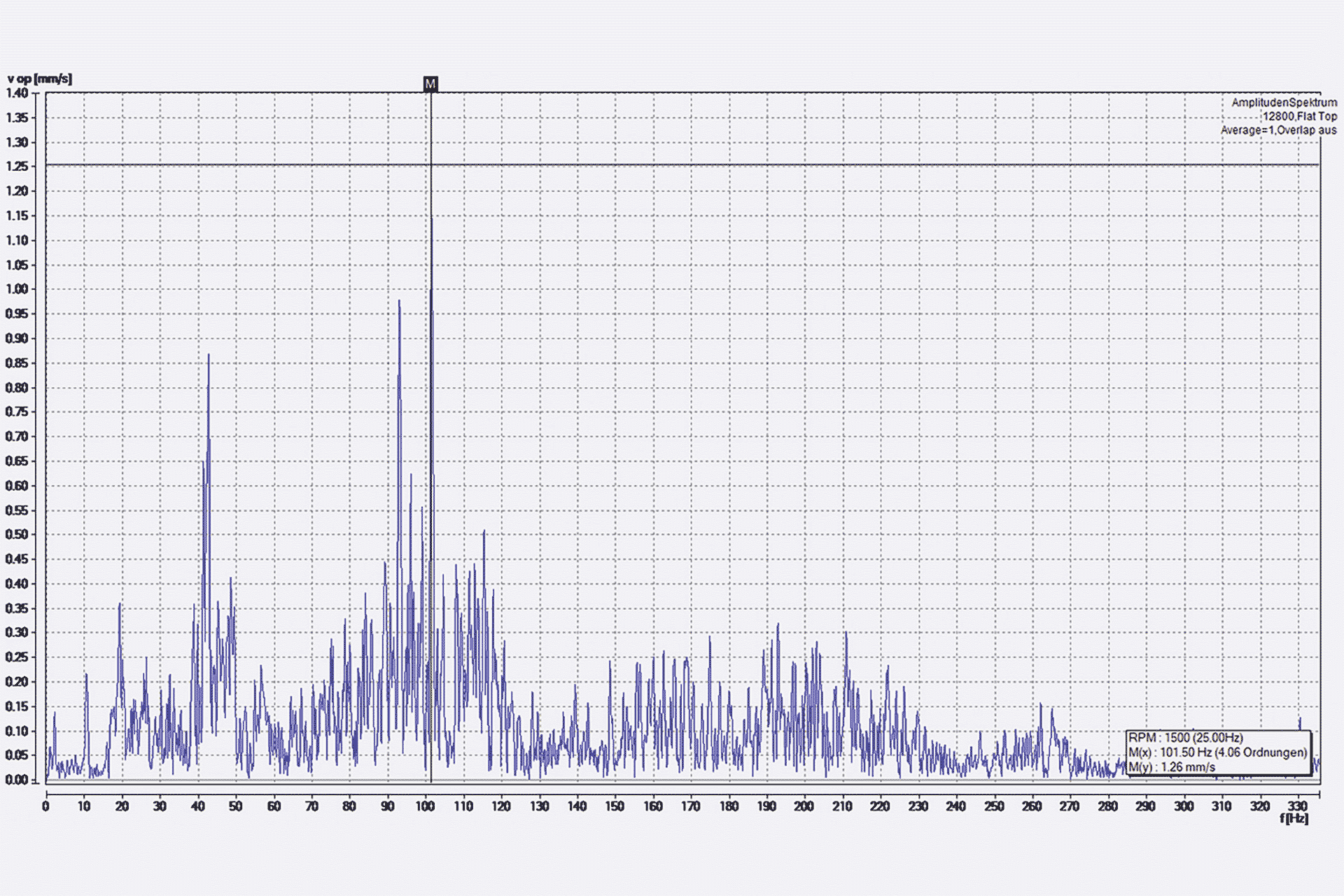 L‘analyse de la mesure des vibrations sur l’appui de la voie de roulement montre des vitesses relativement élevées du signal en fonction du temps, allant jusqu‘à 20 mm/s. Le spectre d‘amplitude correspondant présente certes des pics à environ 45 Hz, 92 Hz et 102 Hz, mais il faut finalement partir du principe que l‘excitation se situe sur une large bande, entre 10 et environ 240 Hz.