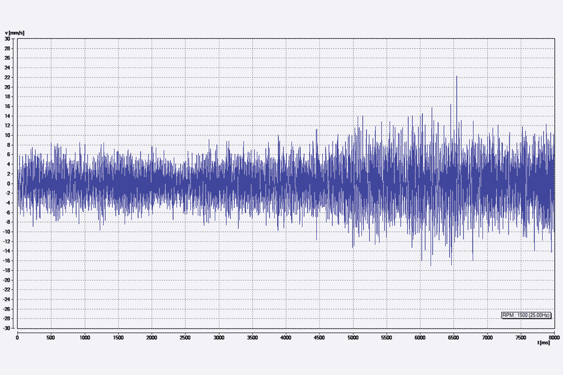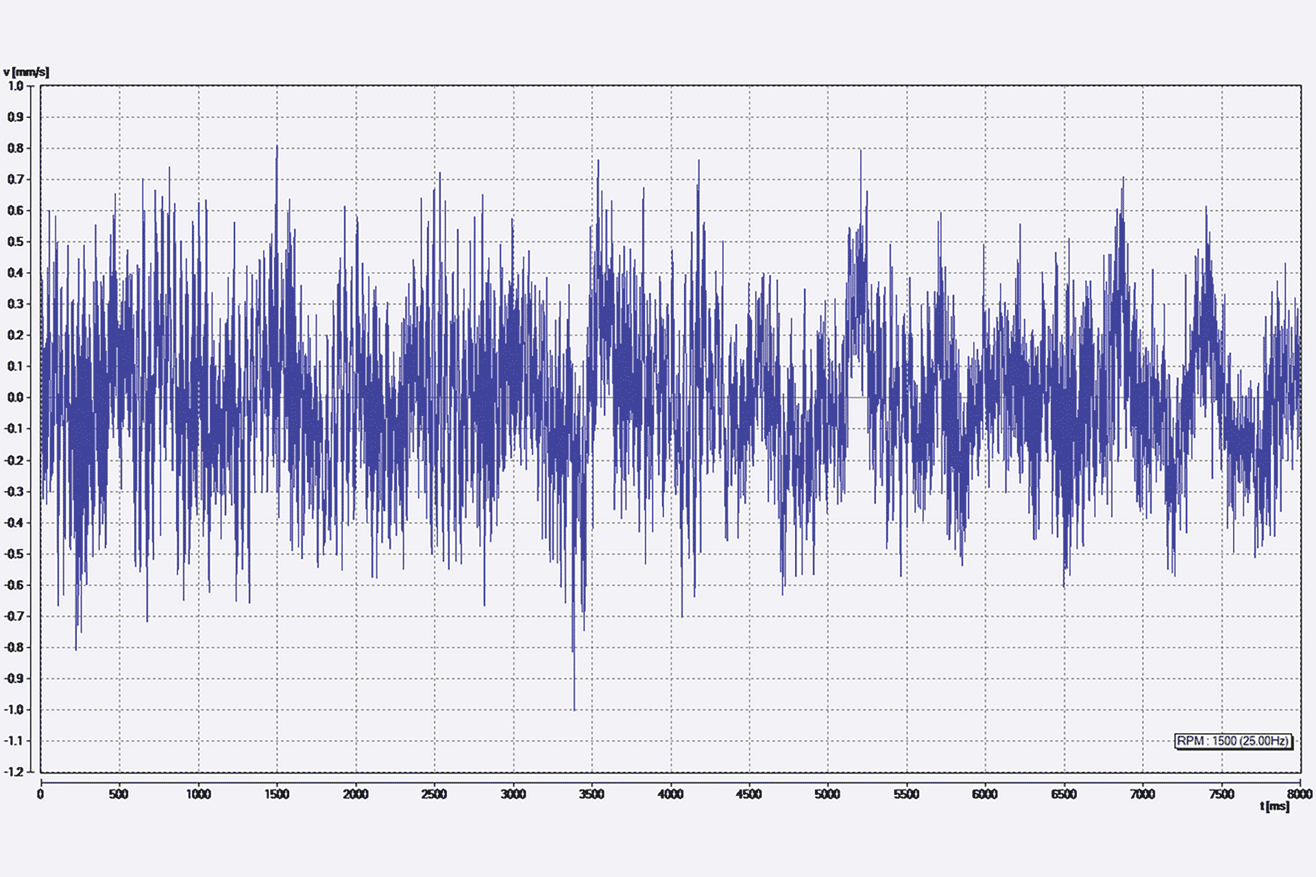 (canal A) lors du déplacement du pont roulant à vitesse maximale et sans charge (déplacement à vide), durée de mesure 8 s, les vitesses maximales sur la poutre sont d‘environ 16.0 mm/s