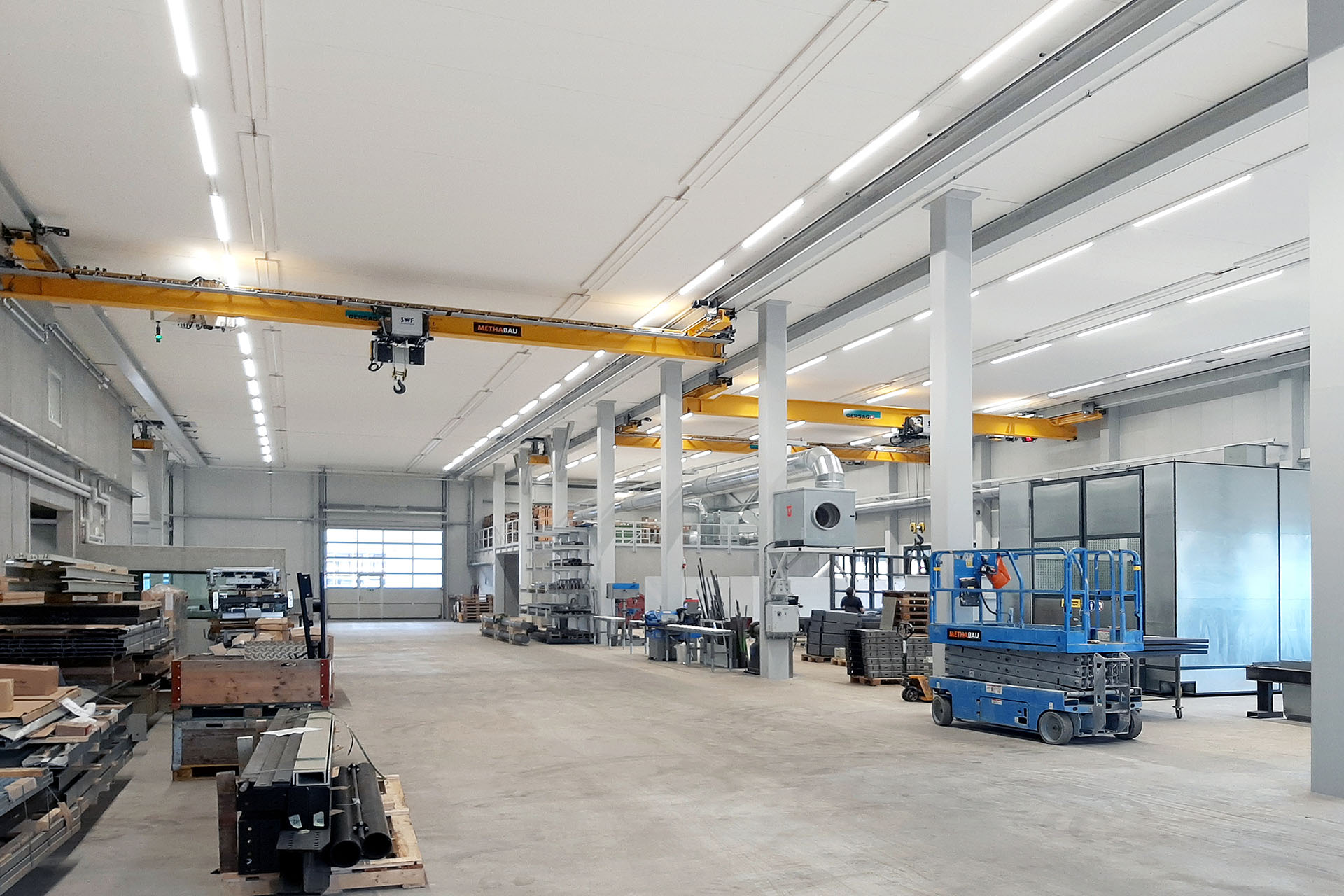 Lors de la construction d‘un nouveau bâtiment de production et de bureaux en Suisse, quatre ponts roulants ont été installés. Le bâtiment a été conçu et construit majoritairement à partir d‘éléments préfabriqués en béton. Ainsi, la structure du plafond est un plafond préfabriqué mixte béton-acier et les murs (cloison de séparation) sont des éléments préfabriqués en béton armé. Avec leurs deux étages, les bureaux sont directement intégrés dans le bâtiment de production et représentent environ un quart de la surface totale au sol. L‘aile des bureaux intègre en outre une salle de formation où ont lieu des formations internes et externes.