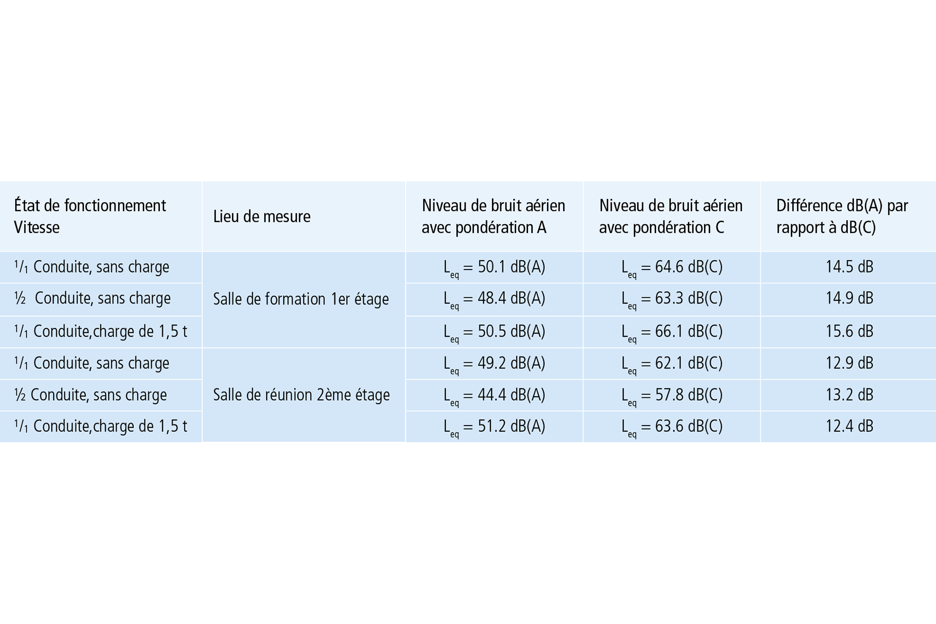 Pendant le déplacement du pont roulant no.2, le niveau de bruit aérien a été mesuré pendant 30 secondes dans la salle de formation du 1er étage ainsi que dans la salle de réunion du 2e étage. Les résultats sont résumés dans le tableau ci-contre :