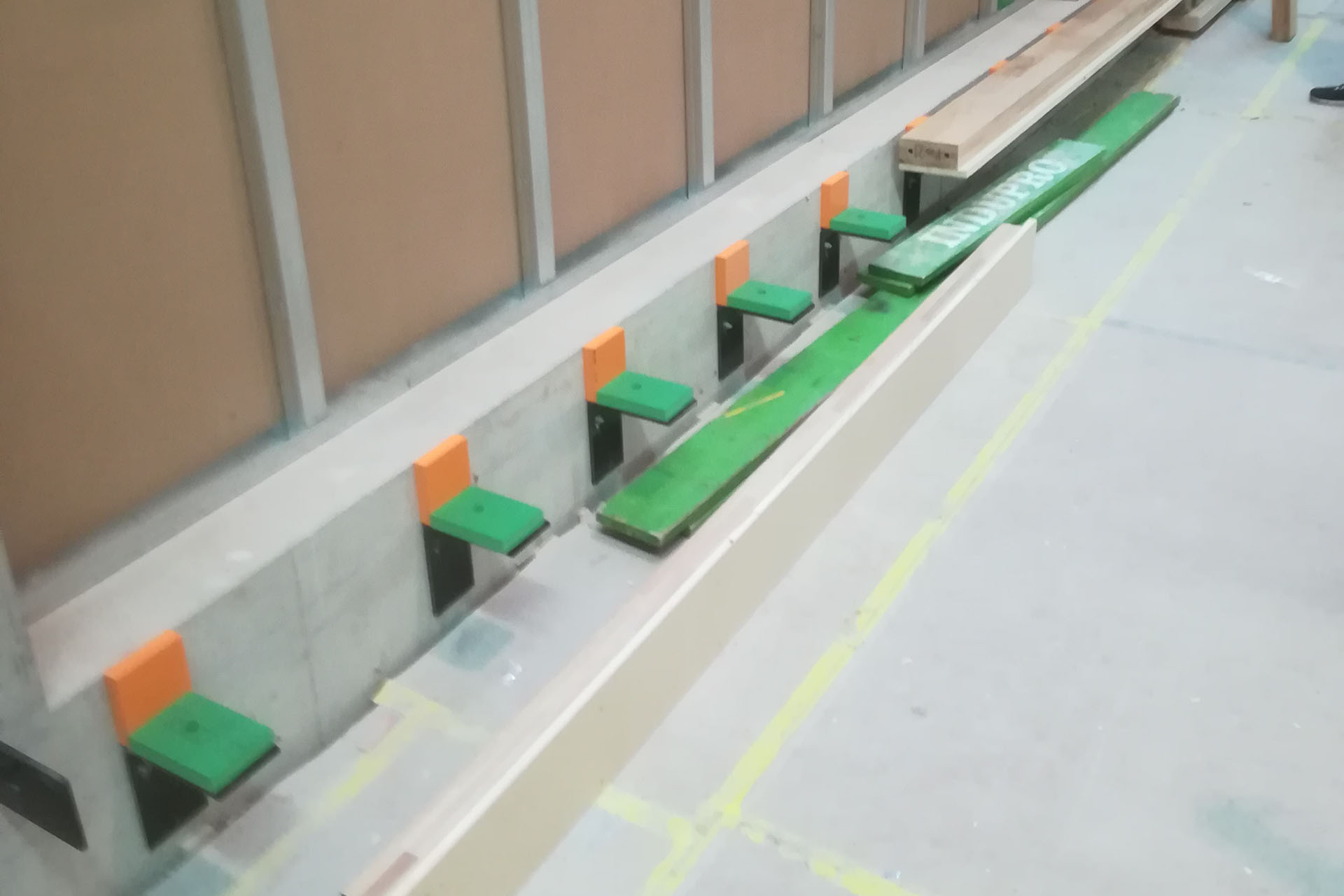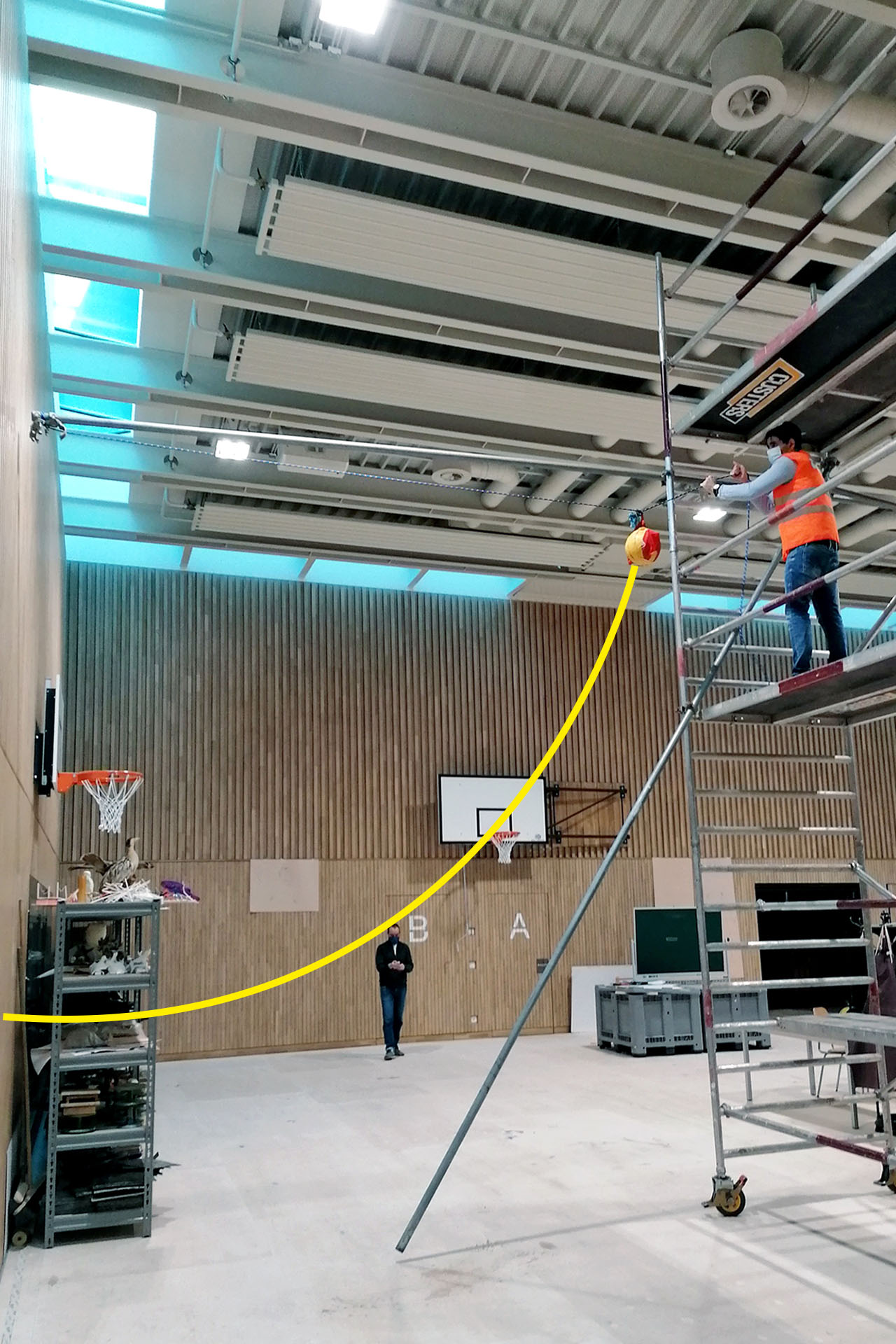 Découplage d’une paroi intérieure (paroi d’impact) dans une salle de sport afin de minimiser les bruits solidiens rayonnés générés par les chocs des balles qui rebondissent.