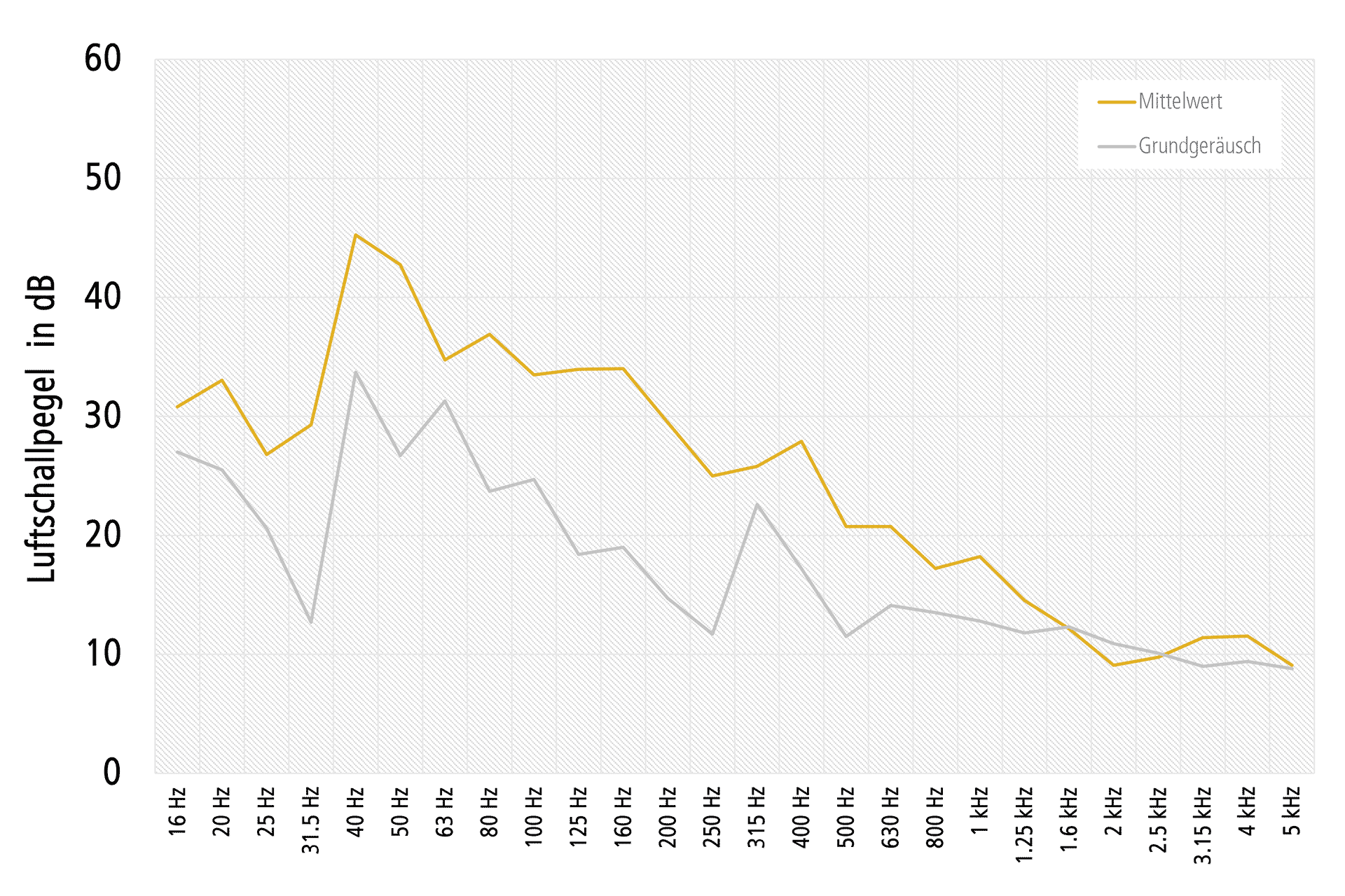 Avec l‘augmentation de la fréquence, les appuis en ISOLMER® réduisent le niveau du bruit aérien induit jusqu‘à un niveau proche du niveau de bruit de fond. Le graphique montre la valeur moyenne du niveau de bruit aérien non pondéré par rapport au niveau du bruit de fond.