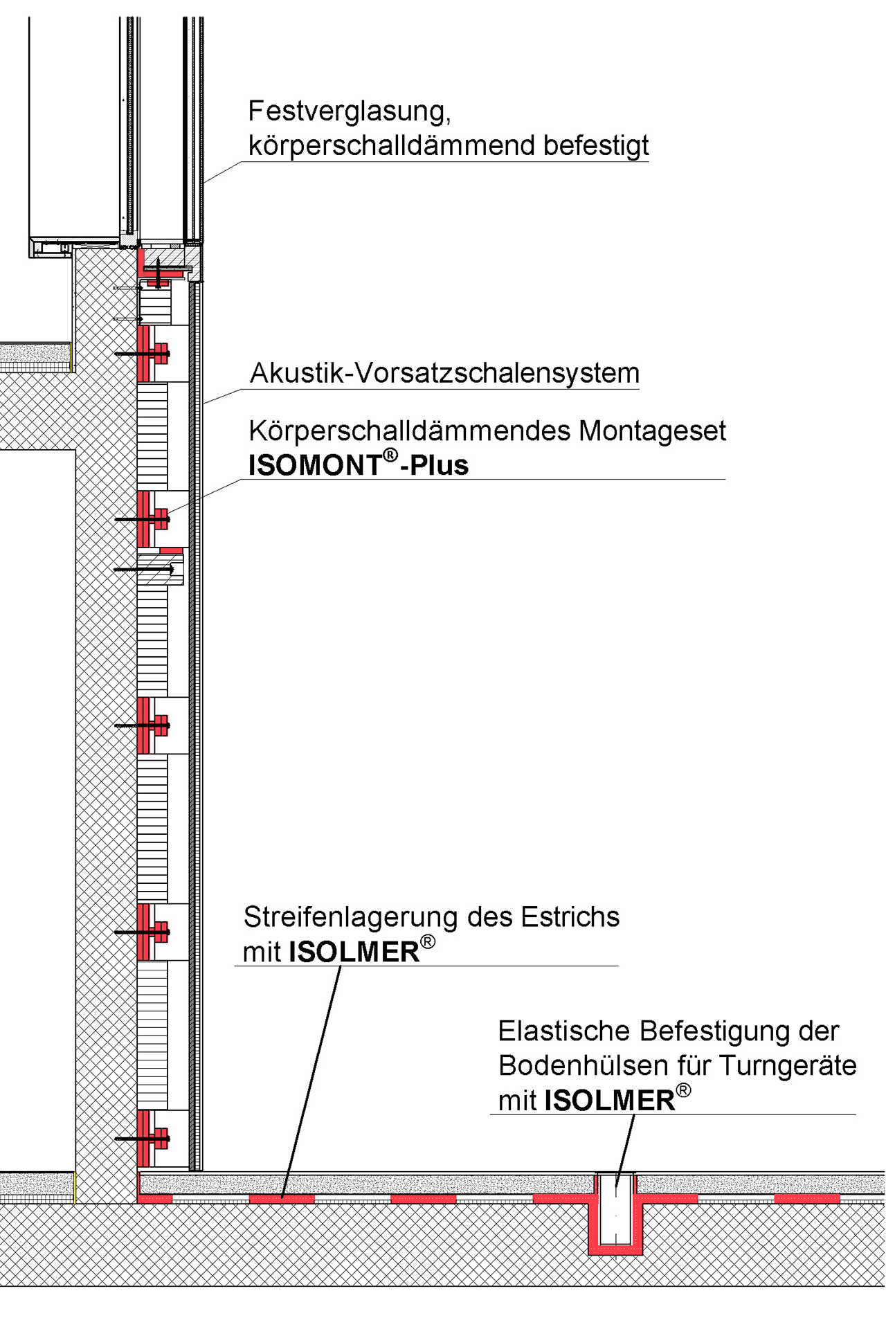 De plus, le sol de la salle de sport a été découplé, sous la chape, à l‘aide d‘un appui en bandes ISOLMER®. Les agrès de sports sont tenus dans le sol par des douilles spéciales, isolant des bruits solidiens.