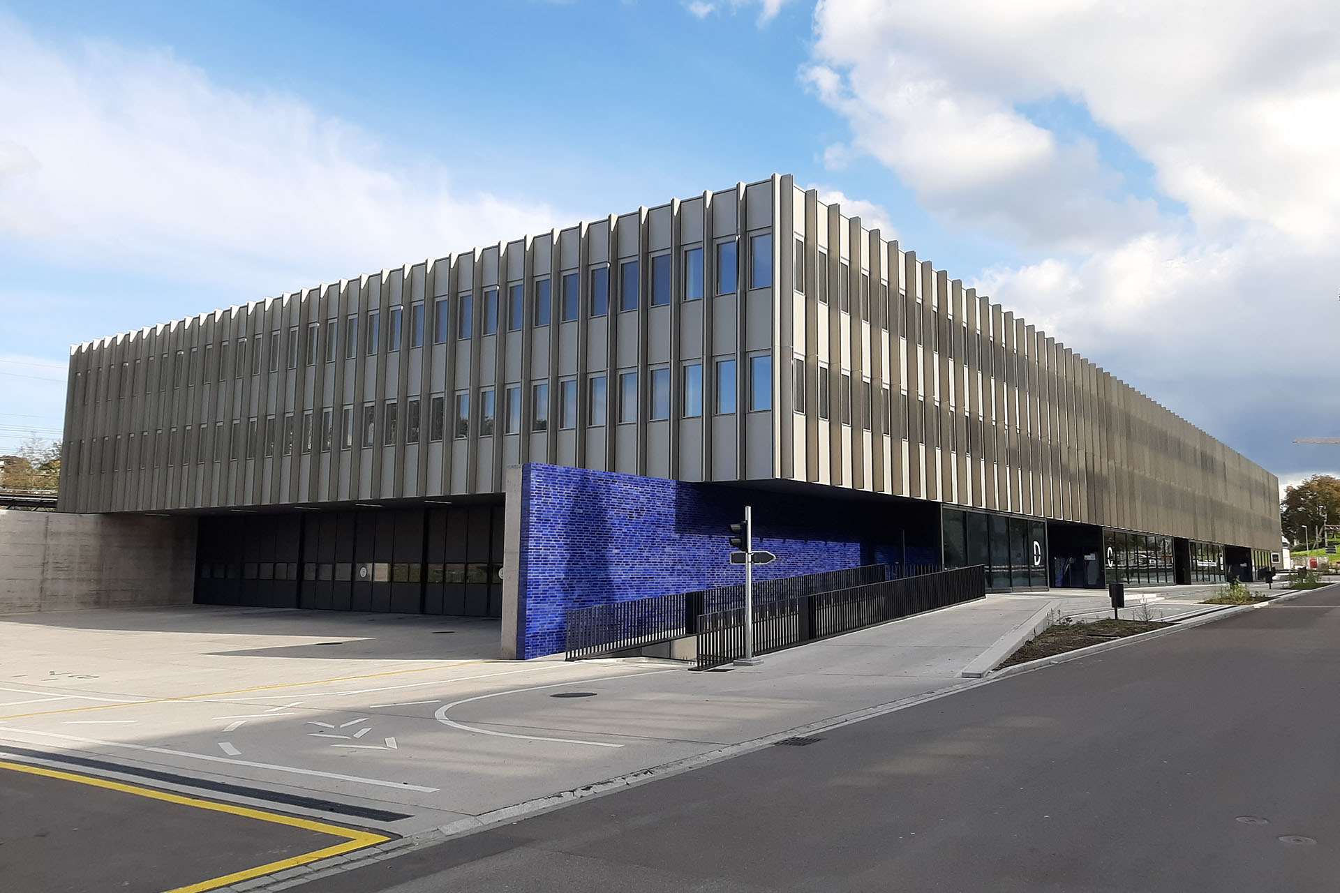 Dans le cadre du projet VZO Schellerareal à Wetzikon (ZH), un bâtiment scolaire avec deux salles de sport a été construit au-dessus d‘un dépôt de bus. Les salles de sport sont disposées au centre du bâtiment et sont entourées par les salles de classe. (voir le plan du bâtiment)