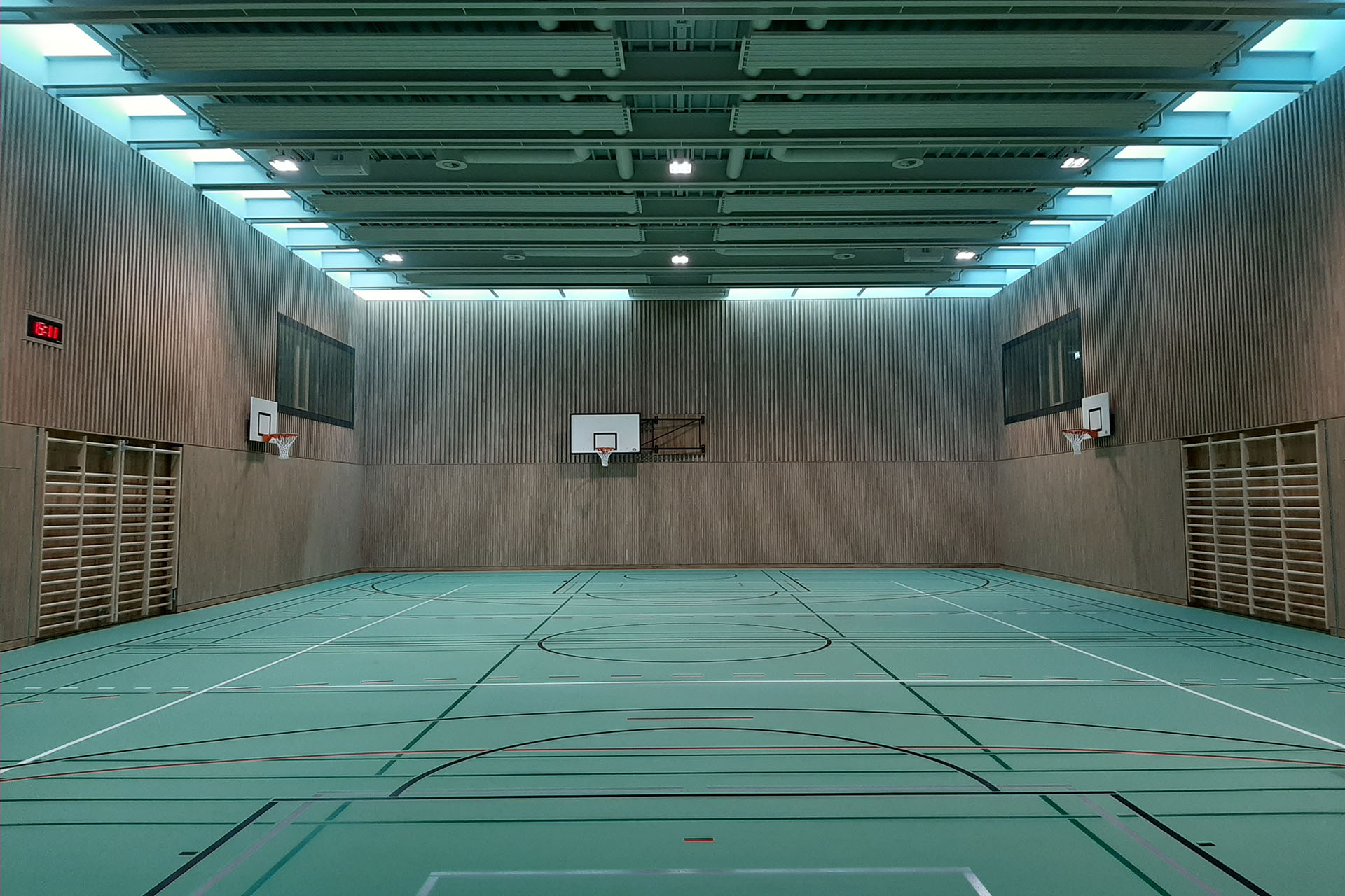 En raison de la proximité des salles de classe, les sols et les murs des salles de sport doivent être découplés élastiquement afin que les bruits solidiens produits par activités de sport perturbent le moins possible les cours dans les salles de classe. De plus, les exigences accrues de la loi sur le travail concernant le niveau d‘exposition au bruit sont à respecter.